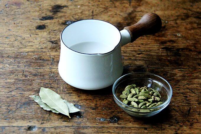 步骤1:热杏仁牛奶半个小豆蔻pod和月桂叶: