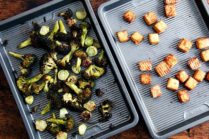 - 热烤箱到400ºF。1号线有边缘的羊皮纸内衬平底锅(豆腐);离开另一个裸(西兰花)。