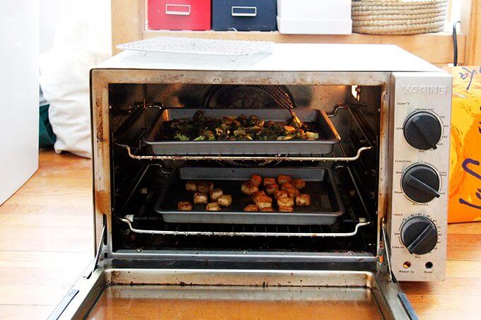 如你所知,我没有厨房(在下面更新!),但即便如此,这道菜在一起非常轻松:总而言之,你在单独的表锅烤花椰菜和豆腐,西兰花拌上橄榄油、盐和胡椒,豆腐和油,酱油,和玉米淀粉(这是一个特别脆皮);西兰花和豆腐煮,你用花生酱油,芝麻油,生姜、大蒜和其他一些成分;完成,你衣服烤花椰菜和豆腐creamy-but-textured辣汁香蒜沙司和小雨这一切如果你的愿望。