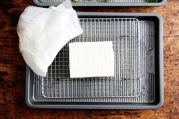 - 准备豆腐:排水豆腐,把它放在一些纸巾;地方更多的毛巾。放置一个沉重的对象大煎锅放在豆腐,,让它休息10分钟(30,如果你有时间)按出多余的液体。(我想做这一套冷却架锅,见下面的照片)。
