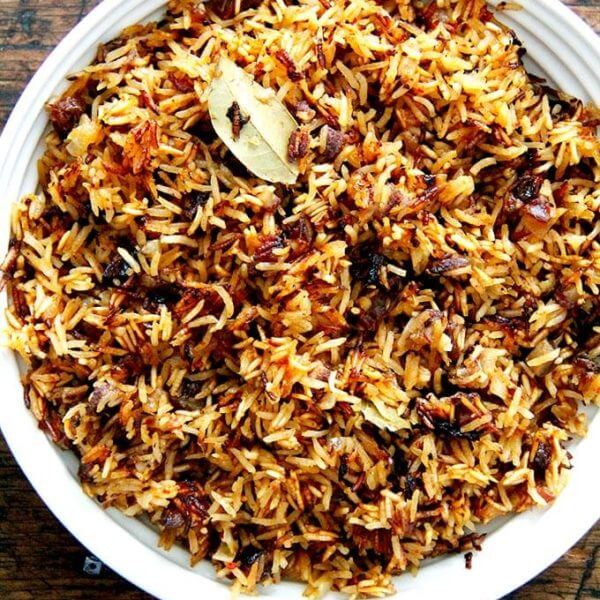 - 传统的肉饭风格:汗水洋葱,加入米饭和调味料,添加液体,封面,和非常低的火煮至熟,大约20分钟。