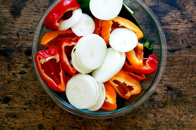 - 蔬菜切成小块(参考照片指导)。衣服用橄榄油和盐。扔掉。味道。添加更多的盐和油,直到蔬菜味道很好。如果需要添加一个挤柠檬醋。如果立即服务,在250ºF烤箱保暖。否则,储存在冰箱里。