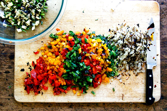 如果你有时间,我建议烧烤一吨的蔬菜。我爱切成小块,如本文所示,因为它们很好手头蛋卷,包装,三明治,烤干酪辣味玉米片,等等。我可以吃直接从冰箱里冷,但是当我做炸玉米饼或烤干酪辣味玉米片,我会再热他们在350ºF烤箱大约10分钟或者扔进一个小煎锅和热轻轻直到它们温暖。