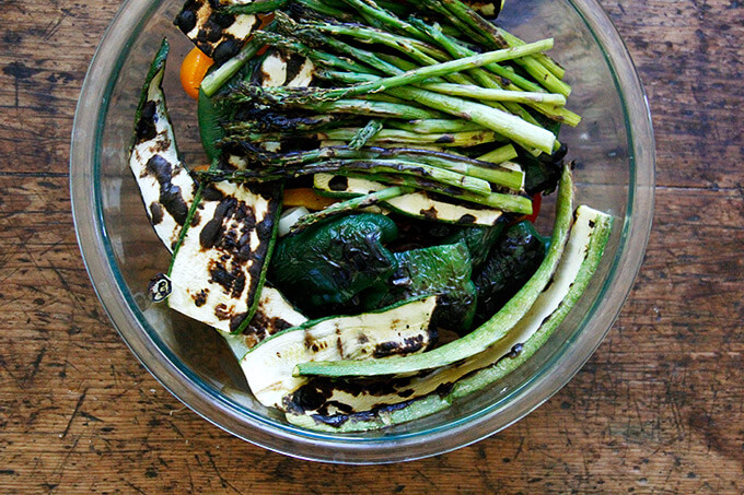 - 保持蔬菜的大块烤肉时,他们不落空的格栅。纵切我切南瓜,茄子,辣椒成季度,芦笋,等等。