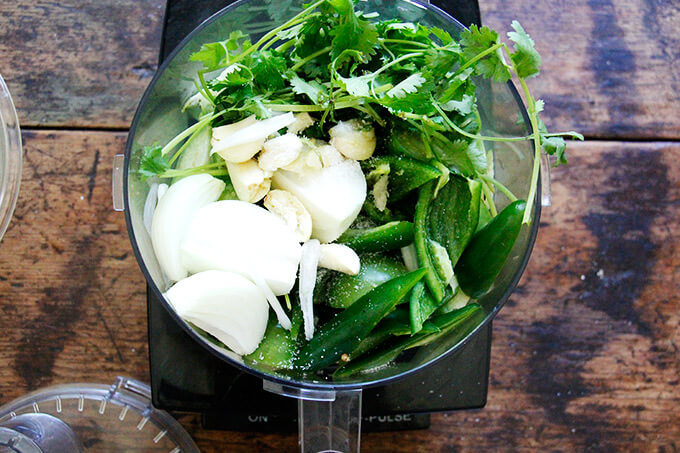 随着大蒜,墨西哥辣椒,香菜,盐,和一个小洋葱或几个葱: