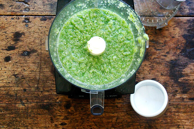 - 与此同时,使粘果酸浆莎莎:将所有成分在食品加工机,里直到变成桃泥。味道。添加更多的盐。