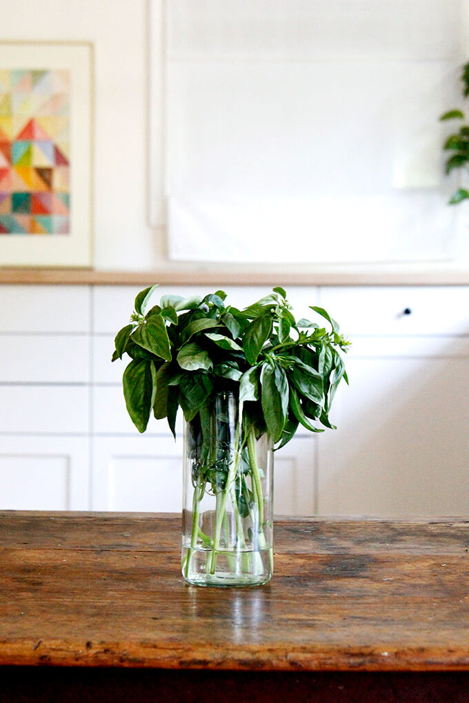 - 罗勒。上周我们走过去,但保持罗勒的冰箱将保留它长/更好。存储:剪掉任何橡皮筋,切断阀杆的底部1/2英寸左右,转移到玻璃或球罐里的水装满了少量的水。见上图。