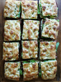 爱的想法,但早上项目的想法似乎比需要更多的工作(更不用说压力2到4 h第二上升将取决于如何冷初始面团和温暖的厨房是…饿孩子也需要一个可预测的喂食时间))的原因不是让佛卡夏的前一天?和烤培根吗?佛卡夏将切好冷,可以很容易地用烤箱加热几分钟余热从烹饪鸡蛋。佛卡夏的培根可以加热或崩溃到蛋组合之前烹饪(你失去脆但获得更少的混乱的三明治)。